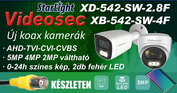 Igaz ugyan, hogy az IP-alapú kamerarendszerek árai már közel kerültek a koax megoldások áraihoz, de még mindig jelen van az igény, régi rendszerek bővítéséhez, illetve kis rendszerekhez sokan ma is inkább analóg megoldást választanának. Nekik is megoldást jelentenek a Videosec új 5 Megapixeles Starlight analóg kamerái, az XB-542-SW-4F csőkamera és az XD-542-SW-2.8F dómkamera. A 4mm-es lencsével szerelt csőkamera vízszintes látószöge 80°, a dómkamera 2.8mm-es objektívje 99°-os látómezőt biztosít.