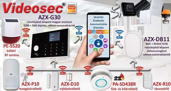A Videosec AZX-G30 riasztásjelző készlethez különféle szenzorokat csatlakoztatunk, a riasztási eseményekről GSM/SMS értesítés mellett Tuya push-üzenetben is tájékoztatást kapunk, illetve az élesítés, hatástalanítás és riasztás eseményei otthonunk / nyaralónk készülékeinek automatikus reakcióit is felprogramozhatjuk.