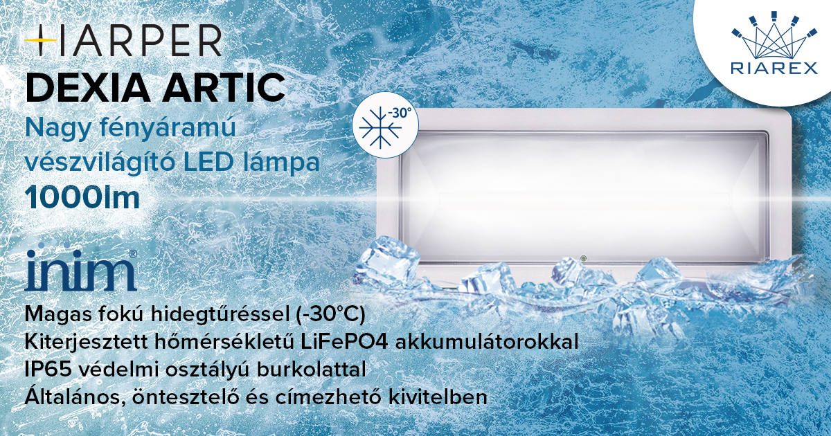 A Riarex Kft. kereskedelmi forgalomba helyezte az INIM által tervezett és gyártott HARPER DEXIA ARTIC nagy fényáramú vészvilágító LED lámpákat, melyek ideális megoldást nyújtanak a hűtött területek, például hűtőházak és fagyasztó helyiségek megvilágítására és biztosítására, ahol a környezeti hőmérséklet akár -30 °C is lehet.